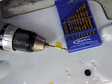先に3MM程度のドリスで下穴をあけてから7MMの穴をあけます。ウチには7MMの鉄鋼ドリルがなかったので6.5MMで開けましたが問題なかったです。ドリルの歯は貫通時にフロアを傷をつけないようにマスキングなどで入りを制限します。