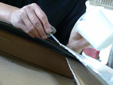 | 実はこの絵になる前の段階でサンルーフ本体と内張り側からの枠で板金を挟む工程があるのですが・・・撮り忘れました^^; サンルーフと枠は10本以上のトルクスネジを使って固定します。内張り側の枠にも防水用のパッキンをはめてから装着する感じです。画像は内張りとサンルーフを馴染ませるためのゴム製の枠がついてしまっている状態です。※内側固定枠の画像も後ほど用意します。 |