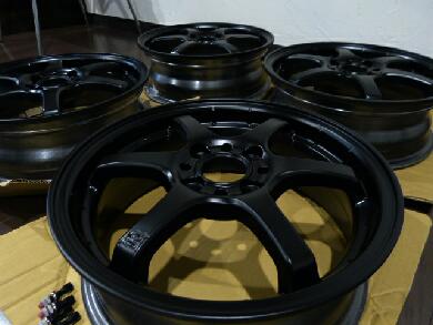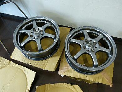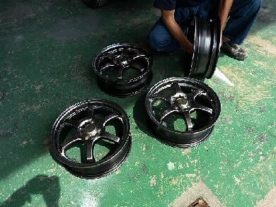 板金屋さんに持ち込んでホイール本体を塗ってもらいます。1つ前の画像と比較しても同じホイールではないような色にみえます。こんな感じで色が変わってみえるパイパー系の色でした。 |