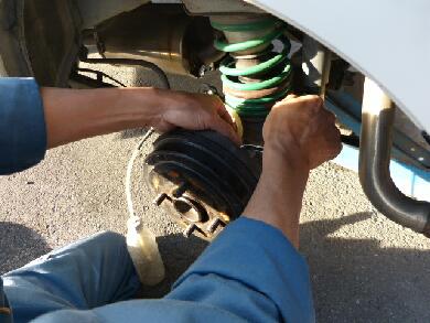 運転席に座ってブレーキを踏む人と、ブレーキホースの先端でナットを締